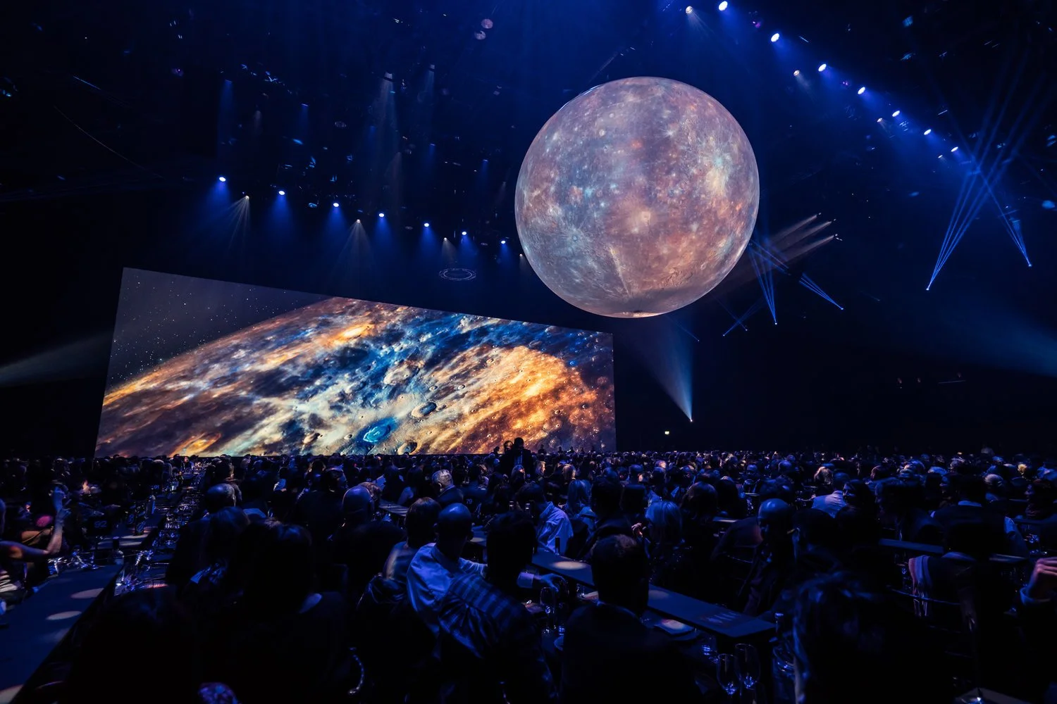 Projected across a 30-metre by 9-metre screen, the film culminated in a fully immersive rocket launch simulation. A 4D soundscape and arena-wide vibration sequence recreated the physical intensity of liftoff, enveloping the audience in the scale and ambition of the mission while maintaining precise audio balance.